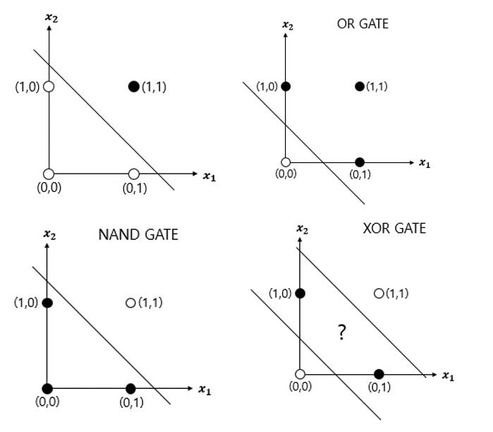 AND, OR, NAND 게이트 연산은 모두 하나의 직선으로 영역을 나눌 수 있는데요. XOR은 곡선이거나 직선이 2개 여야만 흰점, 검은점 영역을 나눌 수 있습니다.