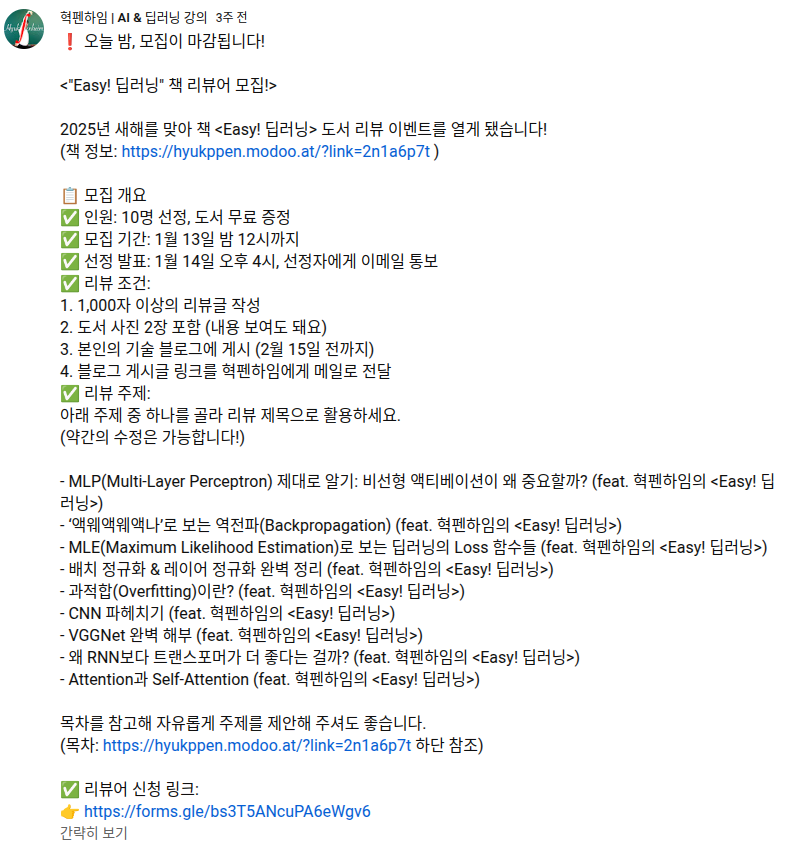 혁펜하임님이 집필하신 <Easy! 딥러닝> 리뷰어로 선정되어 이 글을 작성하게 되었습니다.