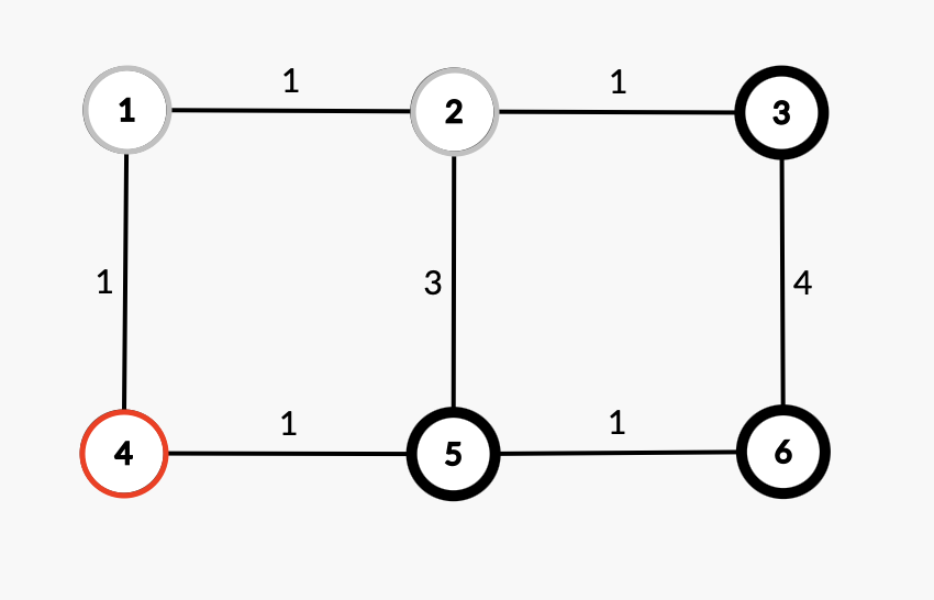 노드2에 대한 작업이 끝났으므로 방문 표시를 해주고 다음 노드(4)를 선택한다.