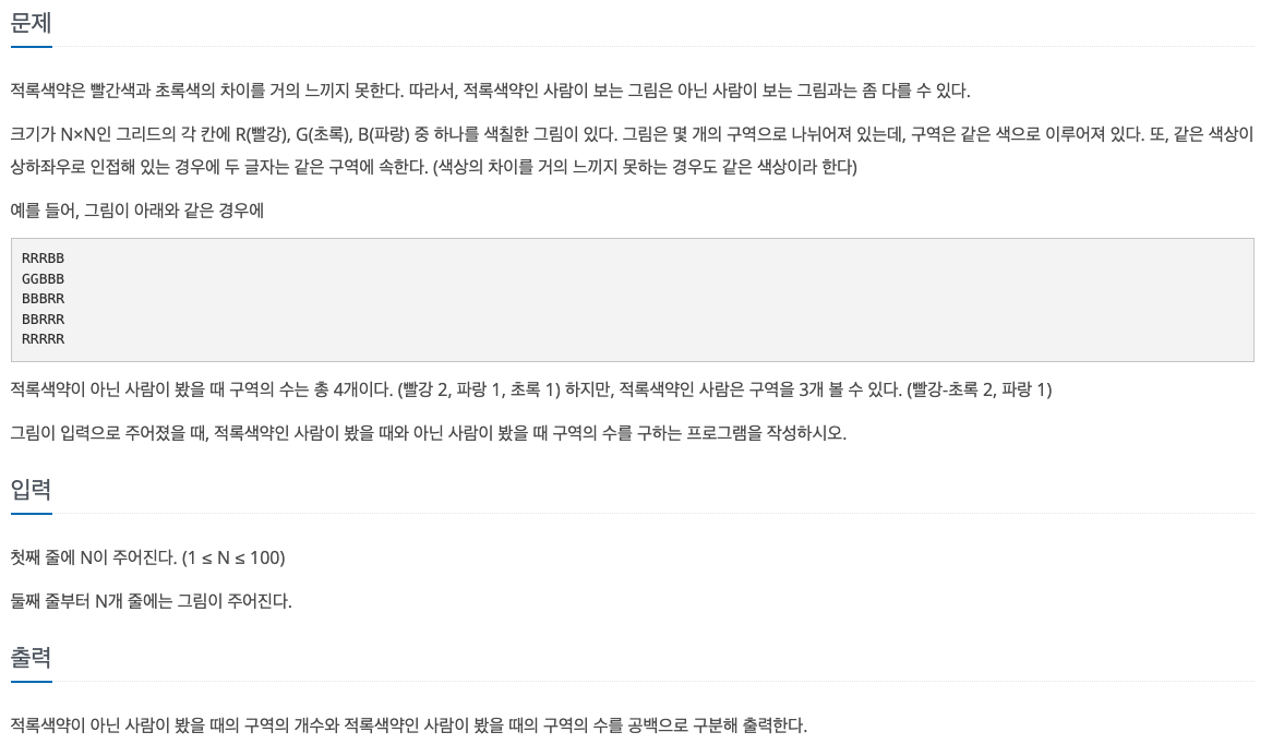 BFS를 한 번 돌면서 정상인과 적록색약의 답 모두 구하는 걸 고민했지만 N의 최대 크기($1 <= N <= 100$)가 크지않기에 시간 초과 걱정은 없었습니다.