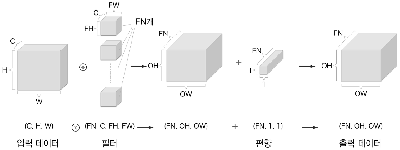 편향은 (FN, 1, 1) 형상을 띄며 출력 데이터는 (FN, OH, OW) 형상을 보입니다.