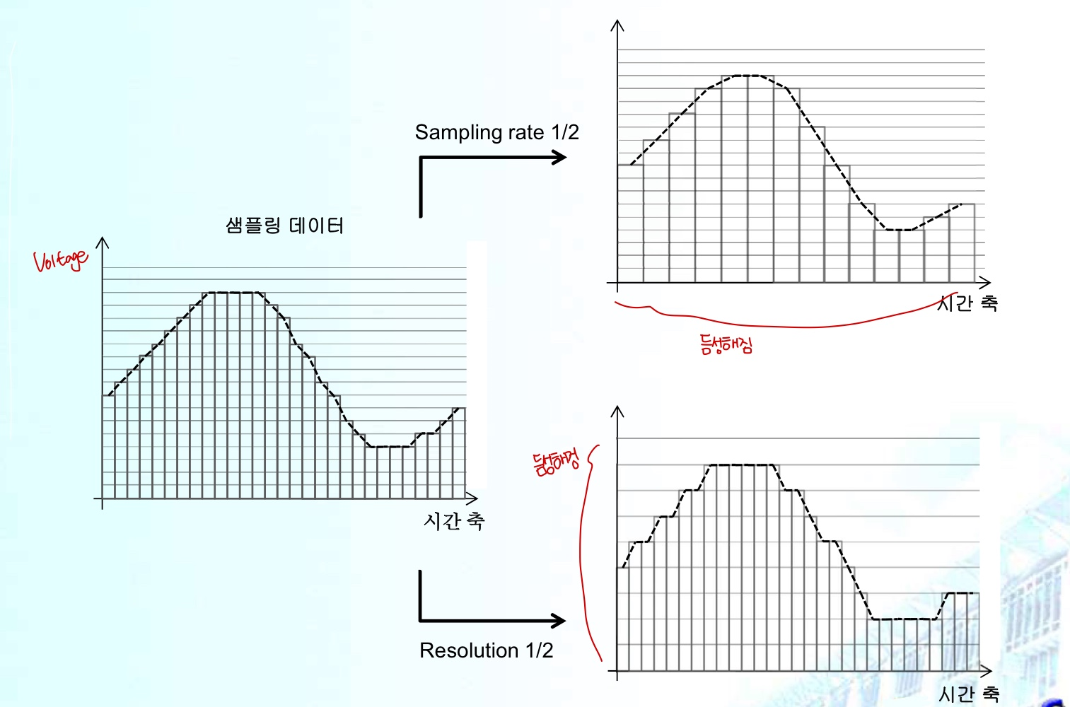 Sampling data에서 Sampling rate를 반으로 줄이면 시간 축 주기가 길어지고