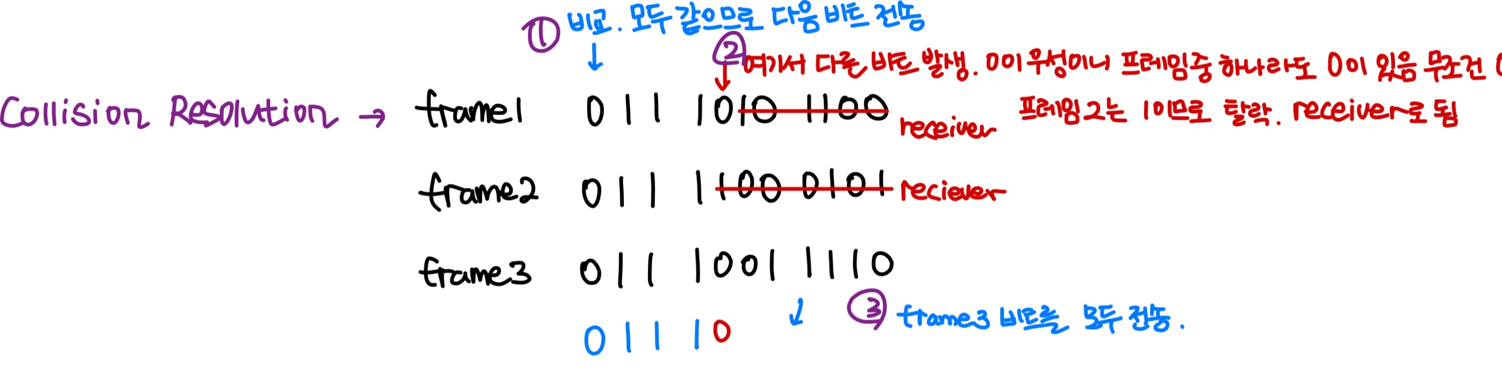 > Collsion Resolution: 구리선이 정보교환으로 사용되고 난 후 여러 요청이 들어올 때 충돌을 해결(우선순위 배정)