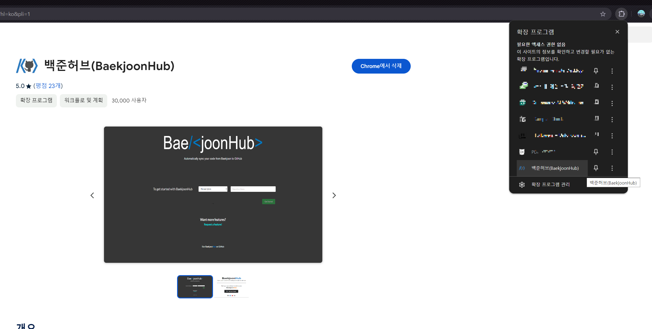 3. 확장 프로그램 목록에서 백준허브 클릭